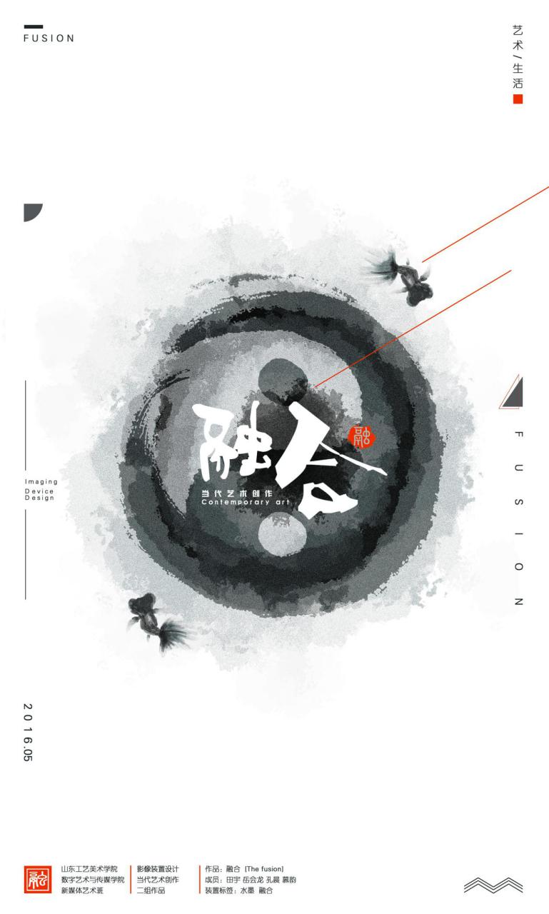 作品《融合》,思考的是一种思想上以及概念上的一种交织。融合不同元素、不同文化,使其相互沟通融为一体。作品以中国传统水墨为元素,制作成了动画影像,然后通过投影仪投射到宣纸上呈现。画面中,真实的金鱼,在投影仪的照射下,鱼的投影会与影像融为一体。在通过设定交互区,当人进入鱼缸前的交互区域时,互动影像和音乐等就会启动播放。通过互动影像表达融合的观点。