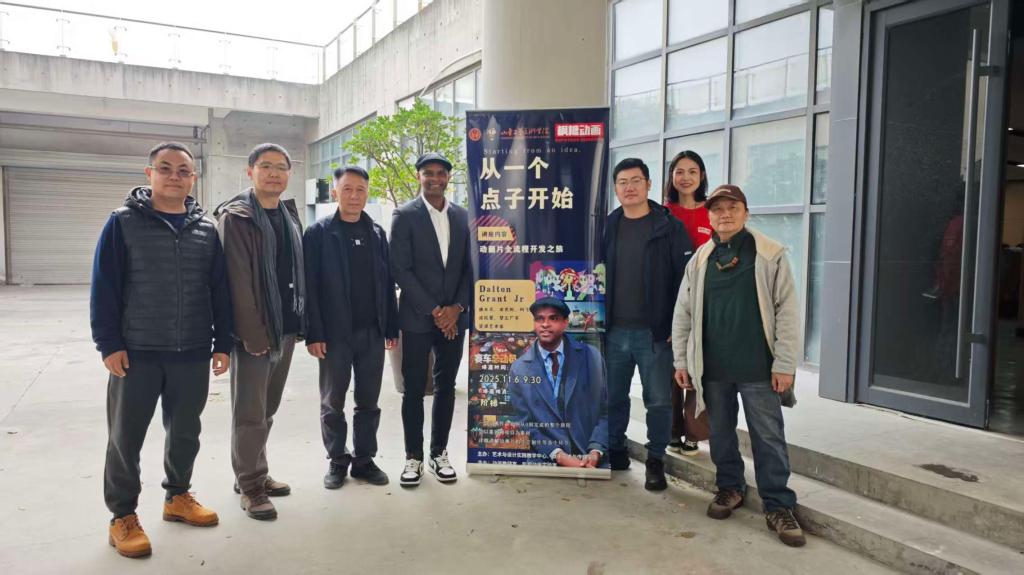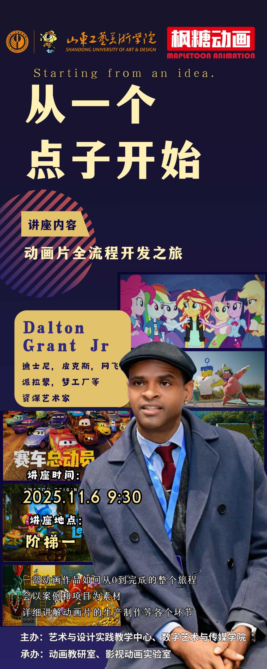 本次讲座特邀枫糖动画公司动画导演 Dalton Grant Jr(曾任职迪士尼、皮克斯、网飞、派拉蒙、梦工厂等知名企业的资深艺术家)担任主讲人,艺术与设计实践教学中心主任高振堂,数字艺术与传媒学院动画教研室主任杨濡豪、副主任艾琳、教师郑琳,枫糖动画负责人李利剑、黄欣婷、李宗辰出席,动画专业全体同学到场聆听。