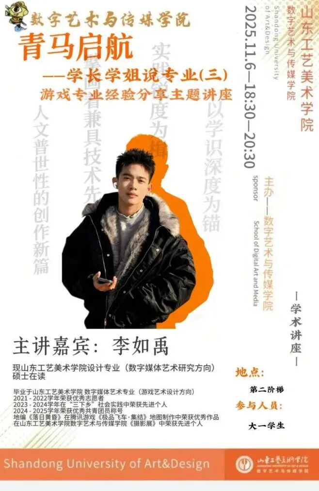 11月6日下午,数字艺术与传媒学院2025—2026学年“青马启航—学长学姐说专业(三)游戏专业经验分享主题讲座”在第二阶梯教室正式开讲了!本次主讲嘉宾由数字艺术与传媒学院设计专业(数字媒体艺术方向)在读硕士李如禹学长担任。