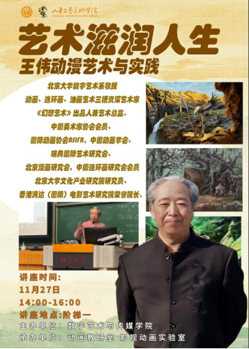 11 月 27 日,山东工艺美术学院数字艺术与传媒学院主办、动画教研室承办的讲座《艺术滋润人生——王伟动漫艺术与实践》在阶梯一教室成功举办。北京大学数字艺术系教授王伟受邀主讲,围绕动漫、连环画创作实践、教学经验及 AI 时代艺术基础培养等核心话题,为学院师生做了深度分享。