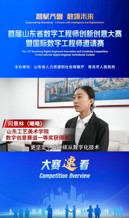 闫景林在闭幕式与颁奖典礼开始前接受了新黄河、大众网、大众日报等多家新闻媒体的专访并简要介绍了参赛心得与创作思路,其个人作品《与1945交手》也已被多家媒体宣传转发。大赛设置人工智能、智能制造、工业互联网、数字创意4个赛道,每个赛道各设一等奖3个、二等奖9个、三等奖12个、优胜奖若干(奖项数量可根据参赛项目报名数量进行调整)。获奖人员由省人力资源社会保障厅颁发奖杯、证书,其中一等奖奖励政策包含: