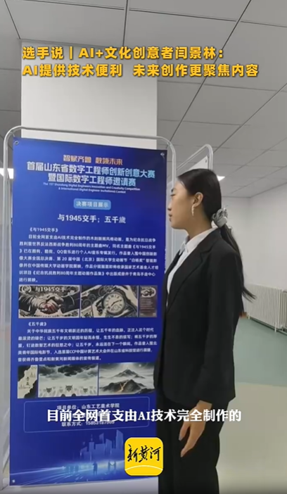 共有280余个项目入围总决赛,经过激烈角逐,最终12个项目获得一等奖。数字艺术与传媒学院研三学生闫景林凭借动画AI作品《与1945交手》以及《五千岁》获得数字创意赛道一等奖。闭幕式环节其作品《与1945交手》作为4个进行现场展示的优秀项目之一。该作品是目前全网首支由AI技术完全制作的木刻版画风格动画,是为纪念中国人民抗日战争暨世界反法西斯战争胜利80周年的主题曲MV,同名主题曲《与1945交手》已在酷狗、酷我、QQ音乐进行个人AI音乐专辑发行。另一动画AI作品《五千岁》内容则是关于中华民族五千多年文明传承的历程,让五千年的血脉,注入这个时代最滚烫的锋芒;让五千岁的文明因年轻而永恒,是生生不息的续写;将五千岁的厚重,钉进数智艺术的狂想之中;让五千岁,永远活在下一个瞬间。
