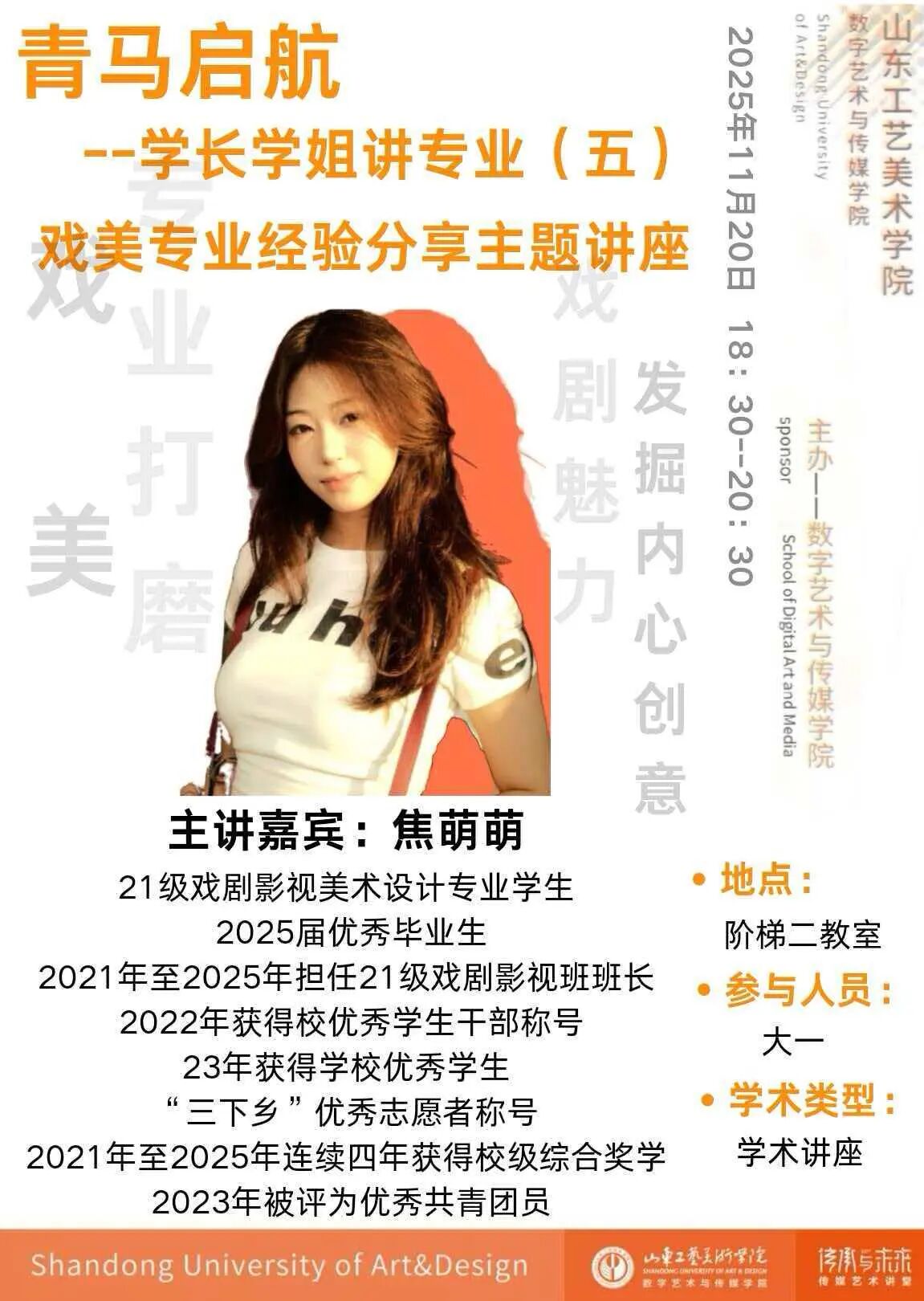 11月20日下午,数字艺术与传媒学院2025-2026学年青马起航学长学姐说戏美专业讲座在阶梯二教室正式开讲了!本场讲座的主讲嘉宾是戏剧影视美术设计2025届优秀毕业生焦萌萌。焦萌萌学姐在戏美美术设计领域表现突出,专业成绩优异,并在多项专业赛事和项目实践中斩获佳绩,积累了丰富的学习与实践经验,是同学们身边可学可感的榜样。