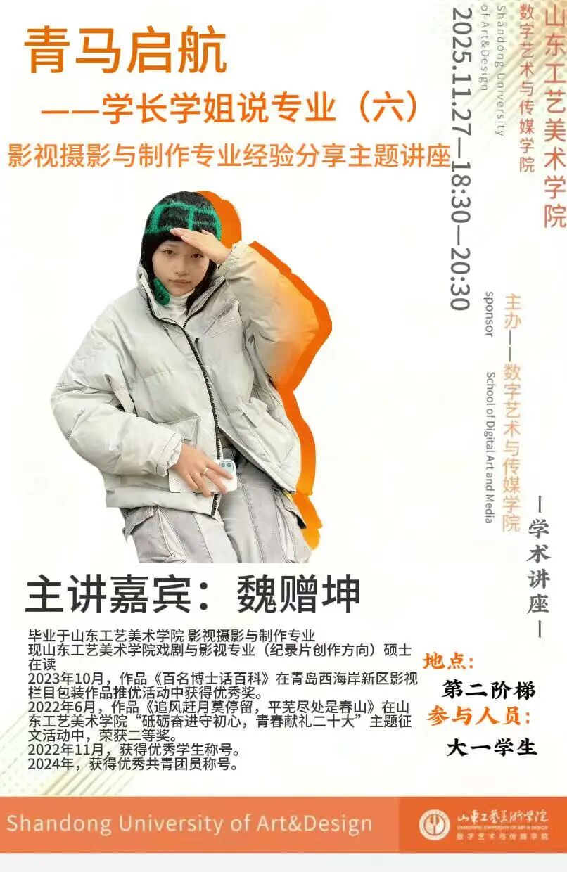 11月27日晚上,数字艺术与传媒学院2025—2026学年“青马启航—学长学姐说专业(六)影视摄影与制作专业经验分享主题讲座”在第二阶梯教室正式开讲了!本次主讲嘉宾由山东工艺美术学院戏剧与影视专业(纪录片创作方向)在读硕士魏赠坤担任。