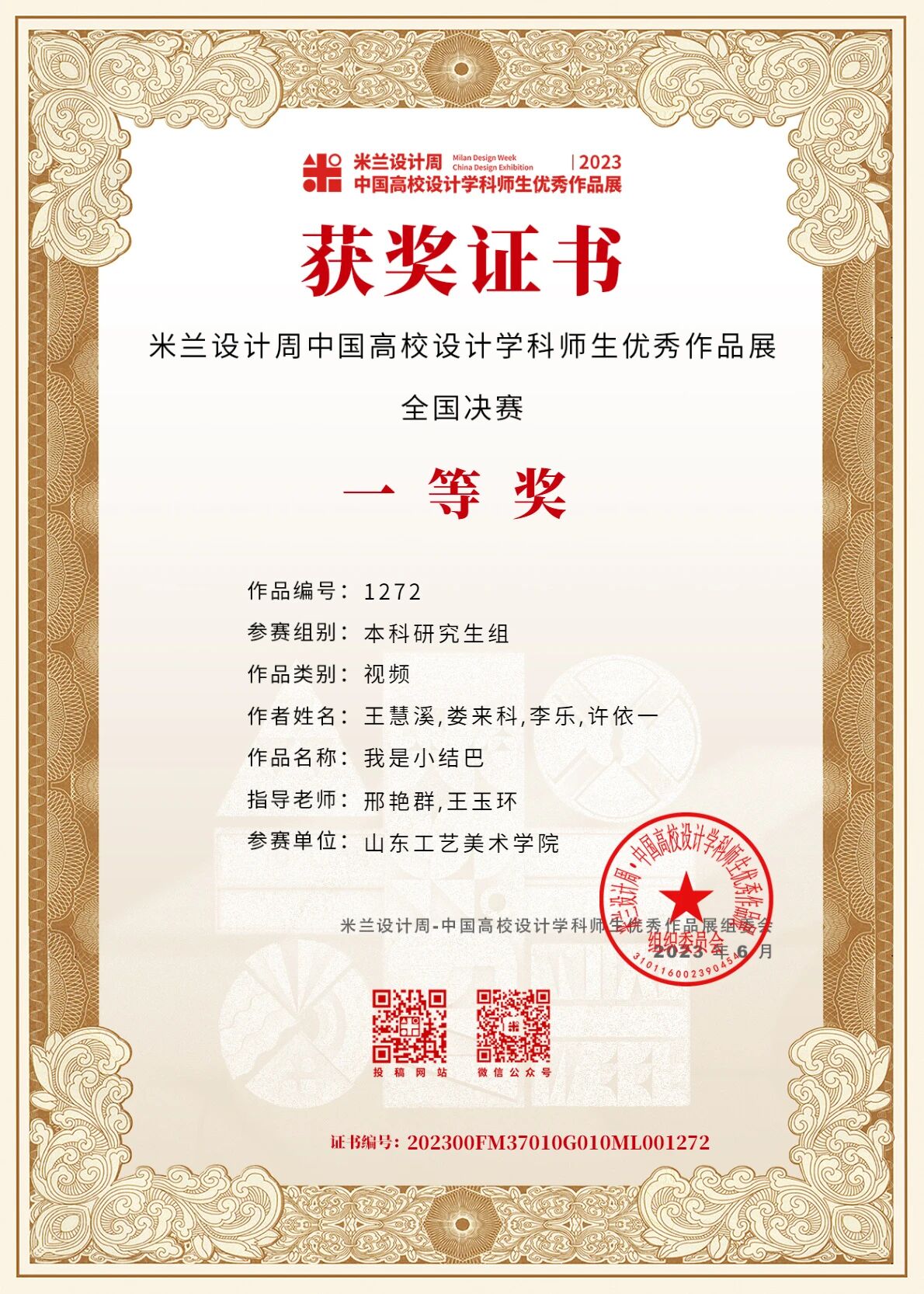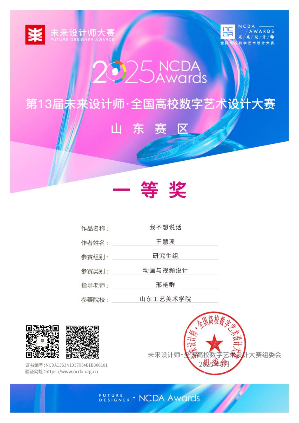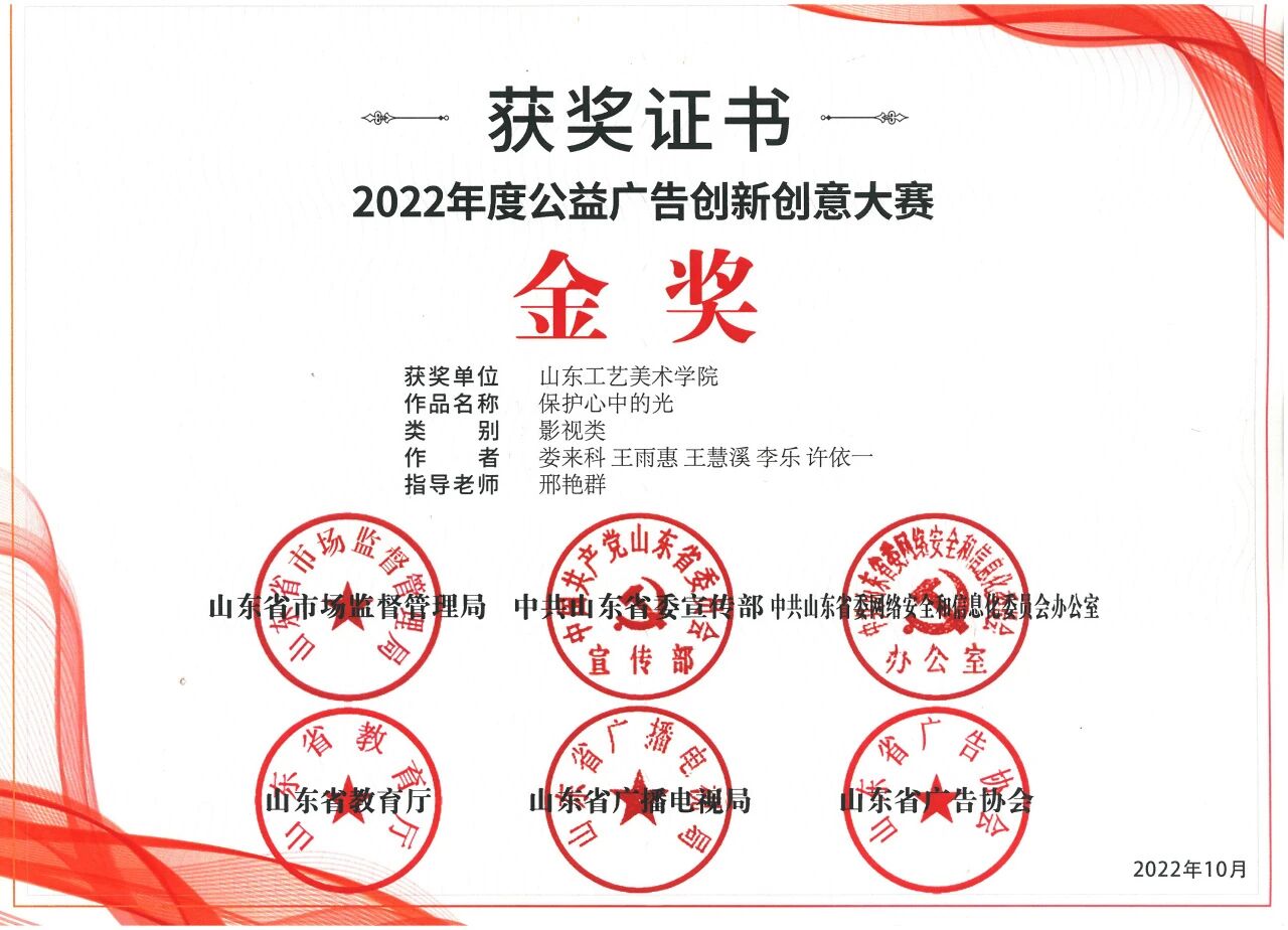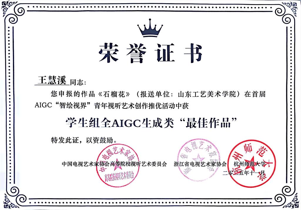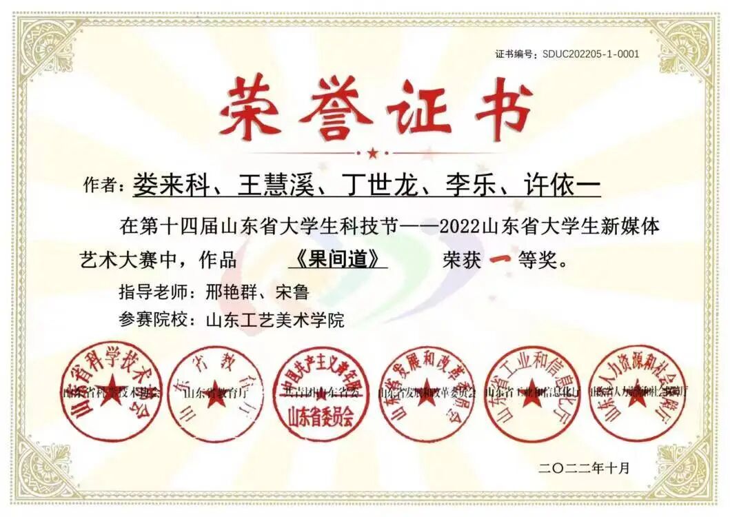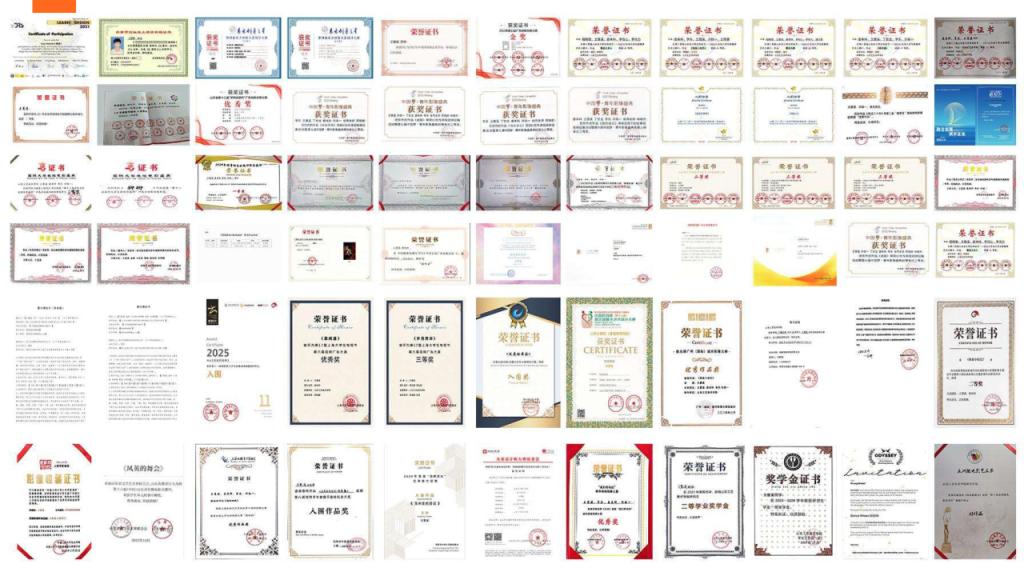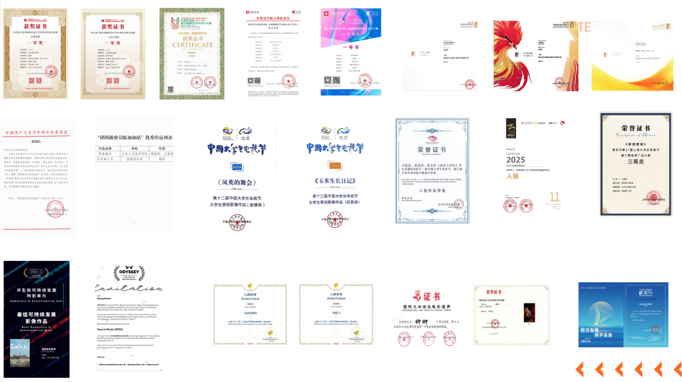曾获得米兰设计周国赛一等奖、中国大学生电视节最佳作品奖、金鸡百花电影节手机影像计划华为荣誉作品、首届AIGC“智绘视界”青年视听艺术创作推优最佳作品、第十七届海峡视听季展最佳作品、华东部分省市微电影大赛最佳作品、粤港澳大湾区微电影大赛最佳创意奖、未来设计师省赛一等奖、山东省大学生科技节一等奖、东方创意之星金奖、中国好创意大赛优秀作品、亚洲微电影艺术节好作品奖等。