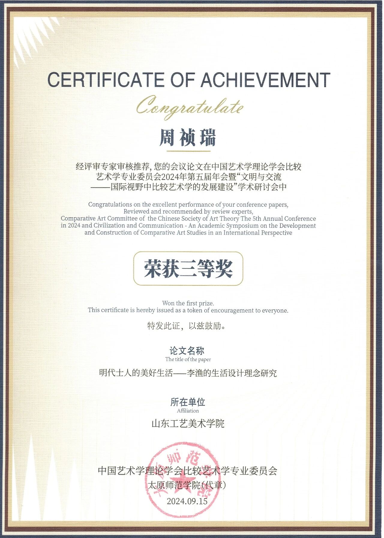 贯彻学术“走出去”与“引进来”方略,聚焦中国传统造物思想、数字影像等主题。在读期间,论文《李渔工艺审美观研究》发表于《当代美术家(四川美术学院学报)》,获得中国知网学术精要“高下载论文”称号。全部论文在知网下载量突破2000次,共被引8次,获中国艺术学理论学会比较艺术学年会三等奖、全国高校红色文化论坛“优秀论文”等国家级、省级各类奖项25次,受邀在中国艺术学理论学会年会、中国设计理论与工匠数智文明研讨会(同济大学)、全国设计哲学研讨会(中山大学)、江苏省研究生创新论坛等高水平学术会议发言17次,1篇论文被国际会议录用并发言,1篇评论文章在“中华网·山东”发布。