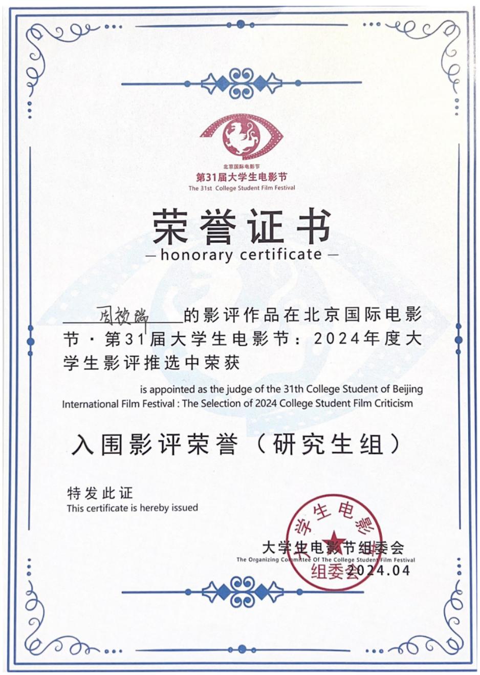 我认为,科研选题要锚定学科前沿并结合自身兴趣,在研究过程中沉心打磨理论框架、反复推敲创新要点,遇到瓶颈时主动查阅资料、虚心向前辈请教,才能稳步推进研究;同时学业与科研本就相辅相成,课堂上紧跟老师思路、课后及时梳理复盘,构建系统化知识体系,才能为科研工作筑牢根基。学会调节心态、张弛有度地平衡研究与生活,也能为漫长的研途积蓄更持久的前行力量,这份荣誉是对深耕的肯定,更愿寄语学弟学妹以热爱为舟、以坚持为桨,在研途上稳步前行。