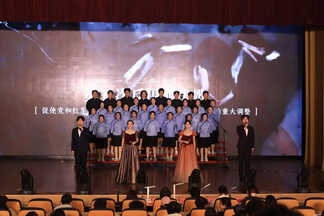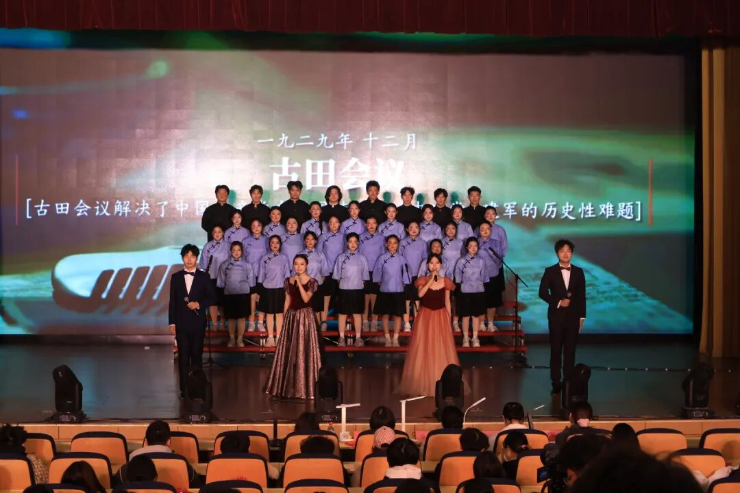 舞台上,同学们化身不同年代的青年志士,以第一视角深情诉说峥嵘往昔。一声声铿锵有力的诵读,一幕幕生动鲜活的情景演绎,将革命先烈的热血初心与当代青年的使命担当紧密相连。诵读声中既有烽烟与呐喊,亦蕴含着不灭的信念,引领着观众重温新中国诞生的壮阔历程,展望新时代的宏伟蓝图,将深沉的家国情怀与昂扬的时代颂歌融为一体。