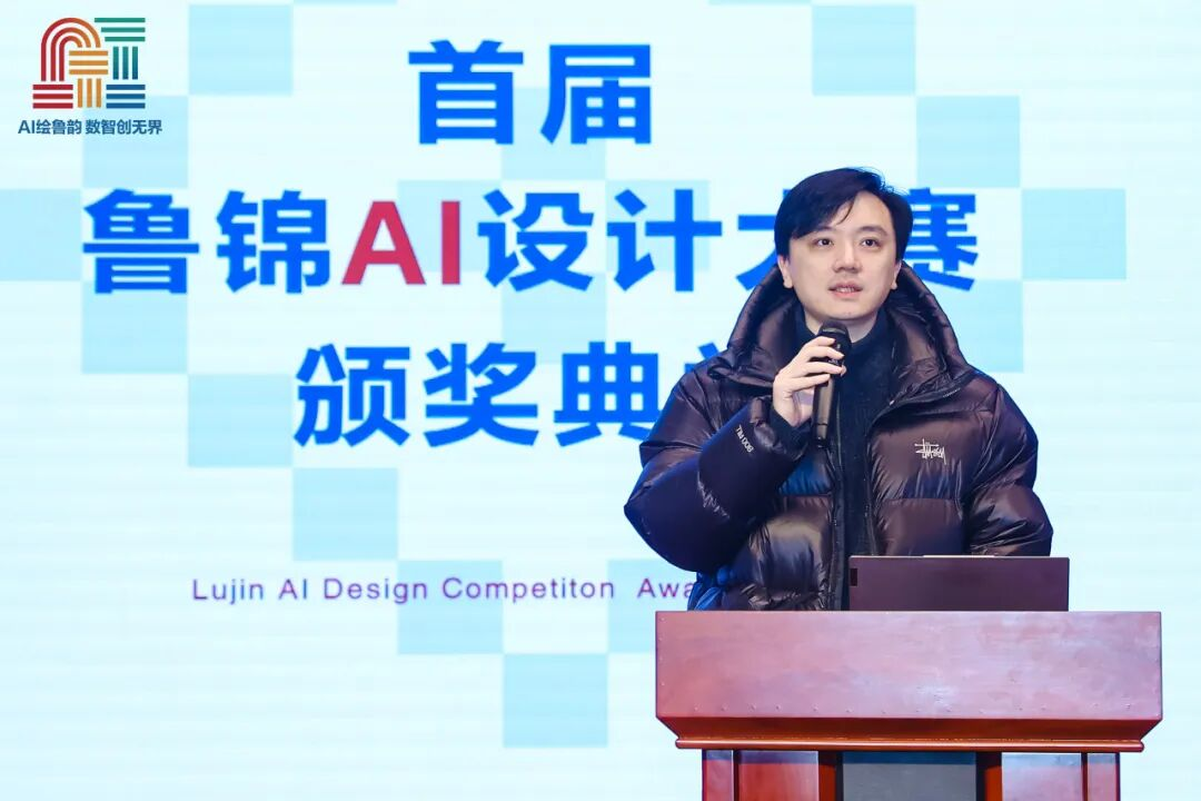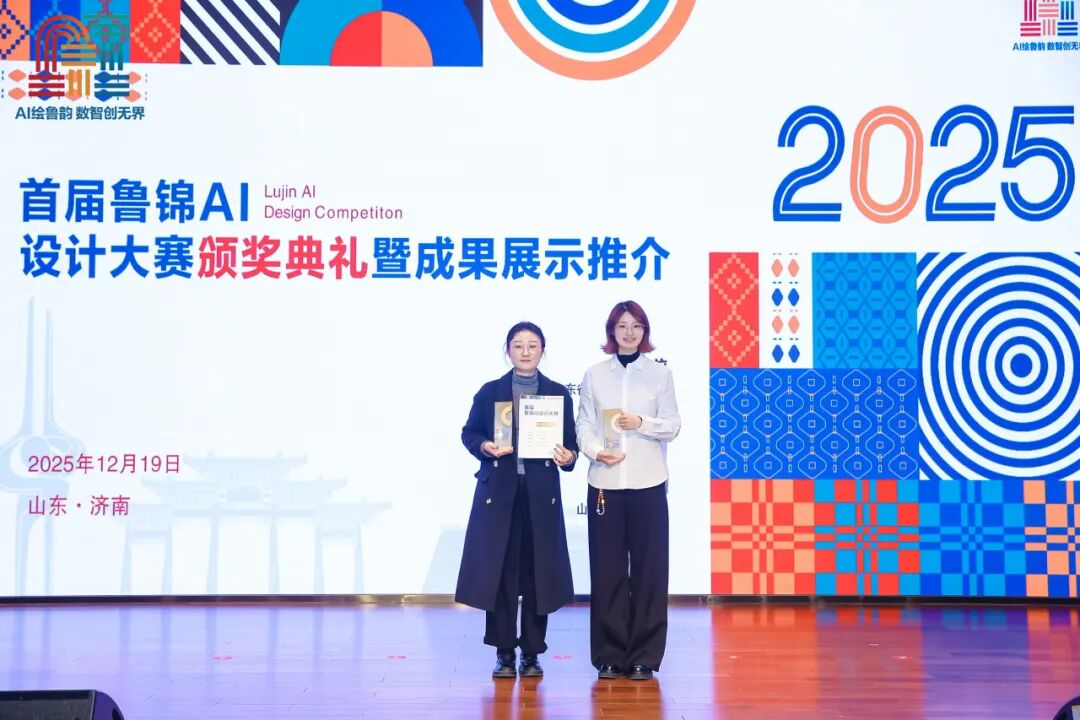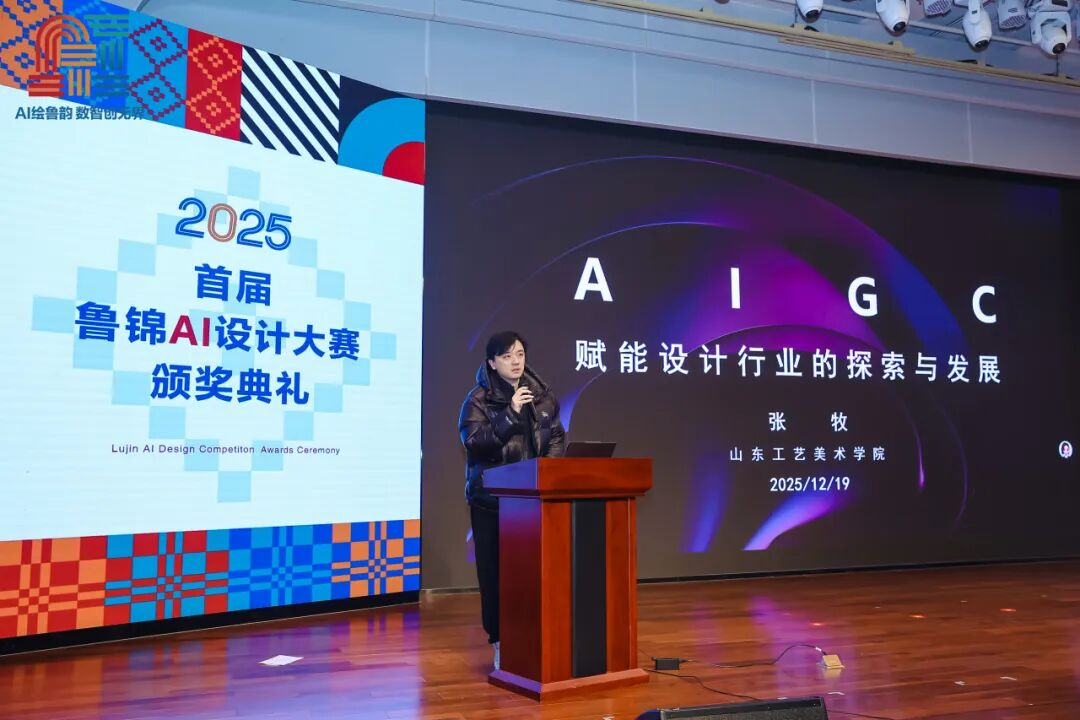 12月19日,山东省首届鲁锦AI设计大赛颁奖典礼暨成果展示推介活动在山东省科技馆举行。我院24级研究生黄亚楠、高丁、朱家耀、王莹、董美琪斩获赛事铜奖,24级本科生王佳怡、张馨怡、张垭垒、乔菲获得视觉表现奖,山东工艺美术学院荣获最佳组织奖。新媒体教研室副主任张牧老师受邀担任特邀嘉宾,以“AIGC赋能设计行业的探索与发现”为题作专题研究分享,充分展现了我院在AI设计教育领域的教学成果与学术实力。